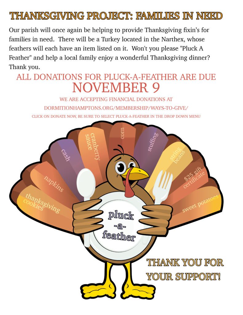 Each Year, Dormition of the Virgin Mary conducts a food drive for families in need at Thanksgiving. There will be a Turkey located in the Narthex, whose feathers each have a food item listed on it. Pluck a Feather and bring the item listed back to Church to be distributed to families who need it. Our Pluck-a-Feather food drive doesn’t only provide fixin’s for a great Thanksgiving Dinner, but also essential pantry items during the cold months of winter.