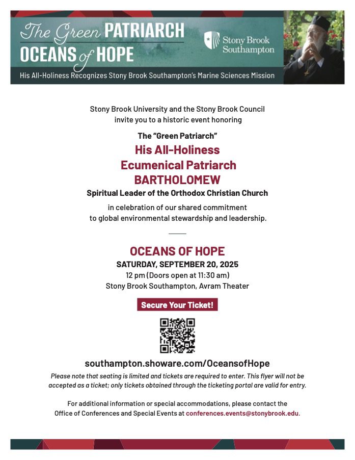 We are thrilled to invite you to a special occasion! Stony Brook University in Southampton will be honoring His All-Holiness the Ecumenical Patriarch for his decades of tireless advocacy for the environment. This is a rare opportunity to witness this prestigious recognition and show our support for his commitment to environmental stewardship.